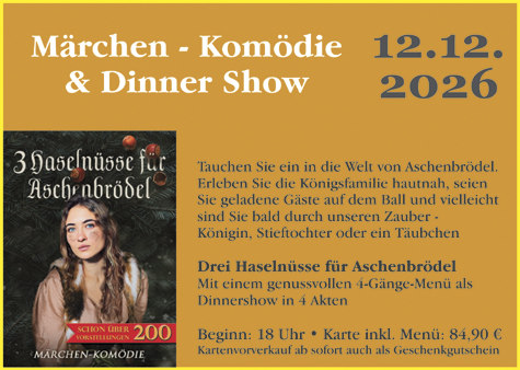 10.01.2026 - Tauchen Sie ein in die Welt von Aschenbrödel. Erleben Sie die Königsfamilie hautnah, seien Sie geladene Gäste auf dem Ball und vielleicht sind Sie bald durch unseren Zauber - Königin, Stieftochter oder gar ein Täubchen.