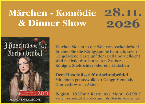 10.01.2026 - Tauchen Sie ein in die Welt von Aschenbrödel. Erleben Sie die Königsfamilie hautnah, seien Sie geladene Gäste auf dem Ball und vielleicht sind Sie bald durch unseren Zauber - Königin, Stieftochter oder gar ein Täubchen.