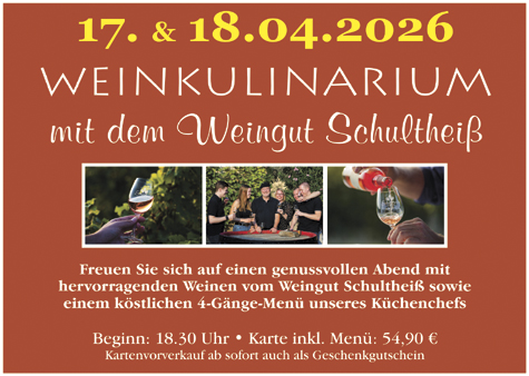 17.04. und 18.04.2026 - Freuen Sie sich auf einen genussvollen Abend mithervorragenden Weinen vom Weingut Schultheiß sowie einen kösstlichen 4 Gang Menü unseres Küchenchefsür!