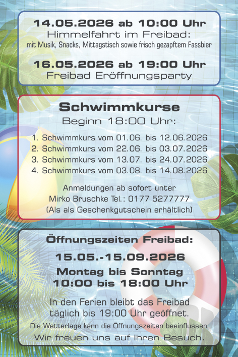 Das Neukieritzscher Freibad ist vom 15. Mai bis 15. September täglich von 10:00 Uhr bis 18:00 Uhr geöffnet.